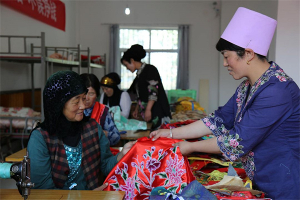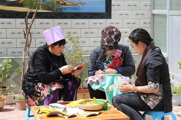 临夏州兆美民族刺绣文化有限公司为领军企业进行传承。临夏州兆美民族刺绣文化有限公司1997年3月注册成立,位于“甘肃省民间刺绣艺术之乡”—临夏县尹集镇。目前公司已收藏了民族民间民俗等各类刺绣工艺珍品13000件,按照回、汉、东乡、保安、撒拉、土、藏等七个民族刺绣特色整理出代表作品3000多件,拜访民间老艺人200多人次抢救性记录了濒临失传的河州民间刺绣特色针法106种并《整理编写了20万字的河州民间刺绣基础教程》,在此基础上,公司开发出了具有浓郁的民族特色,鲜明的地域特色,强烈的时代特色的手工刺绣工艺品四大类(即手工绣花鞋、鞋垫、室内床上用品、服饰服装、装饰挂件)200多个花色品种,注册了“尕豆妹”商标,131项外观设计获得国家专利,专利产品占现有产品的比例达到60%以上。其中回族婚礼服饰和东乡族妇女服装等17件刺绣作品分别被国家民委、全国妇联、中央民族大学博物馆等部门收藏。46件产品在省内外各类展评活动中获奖。