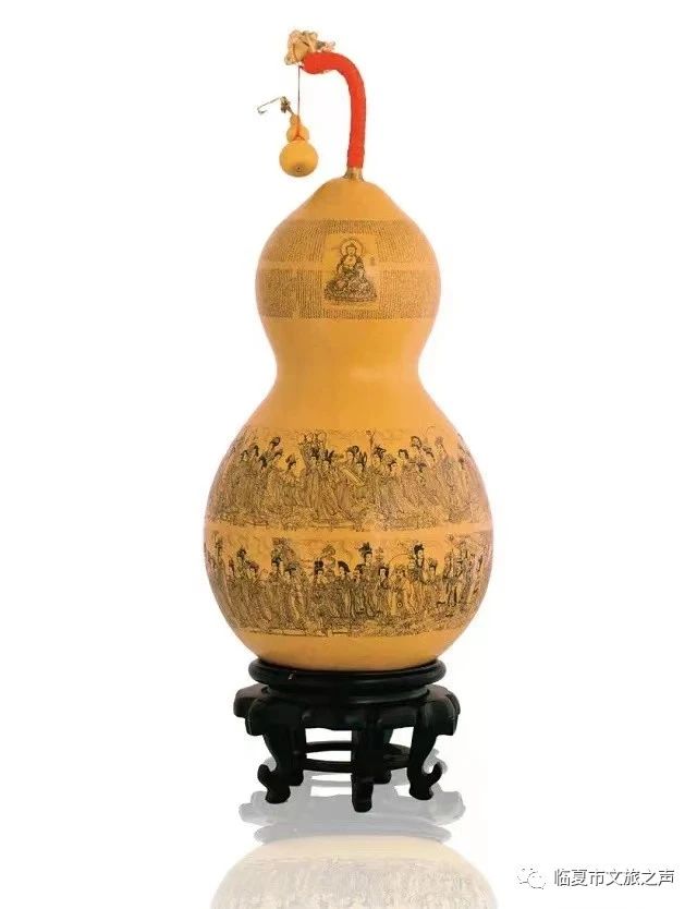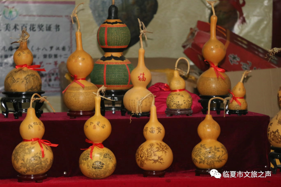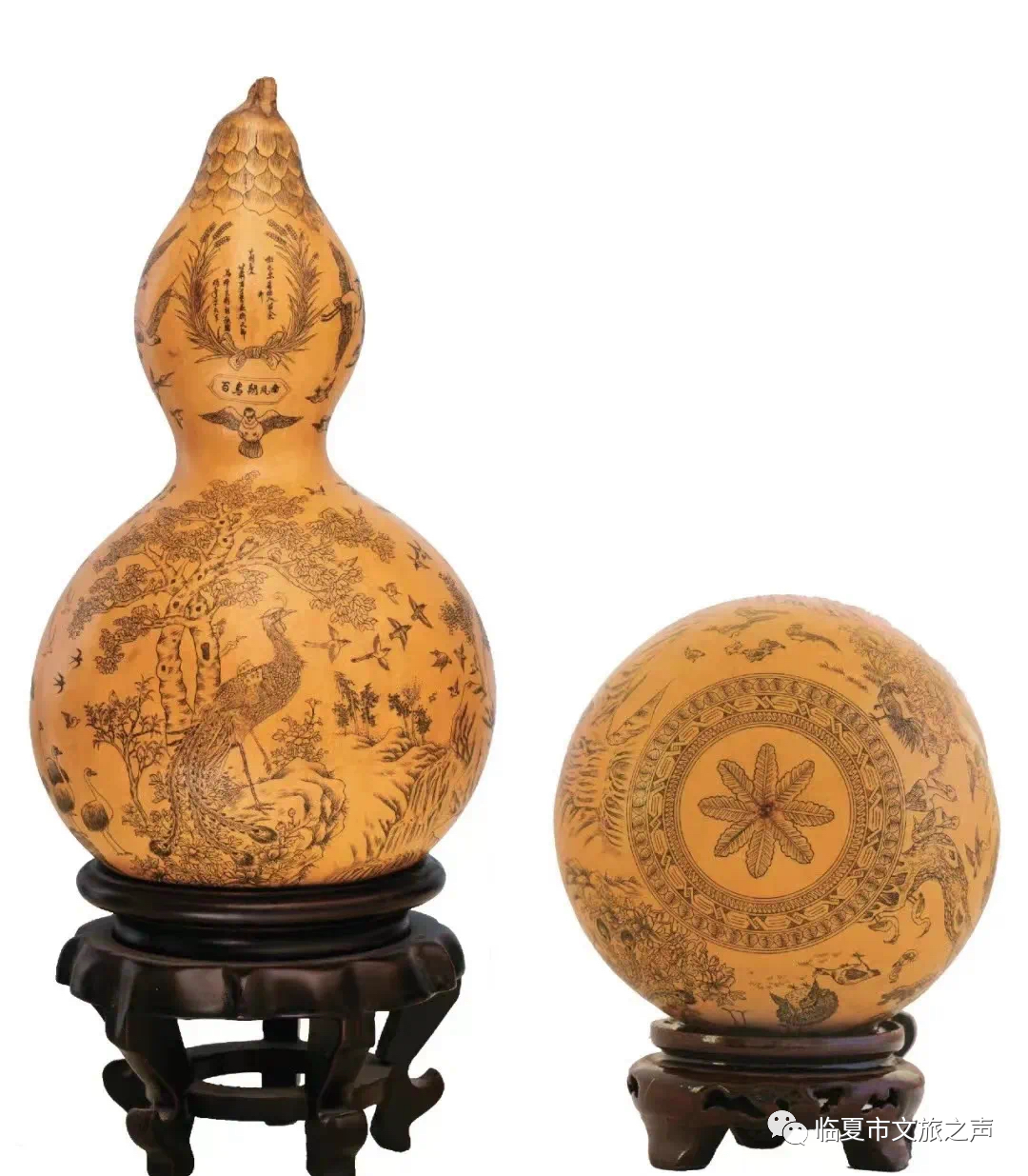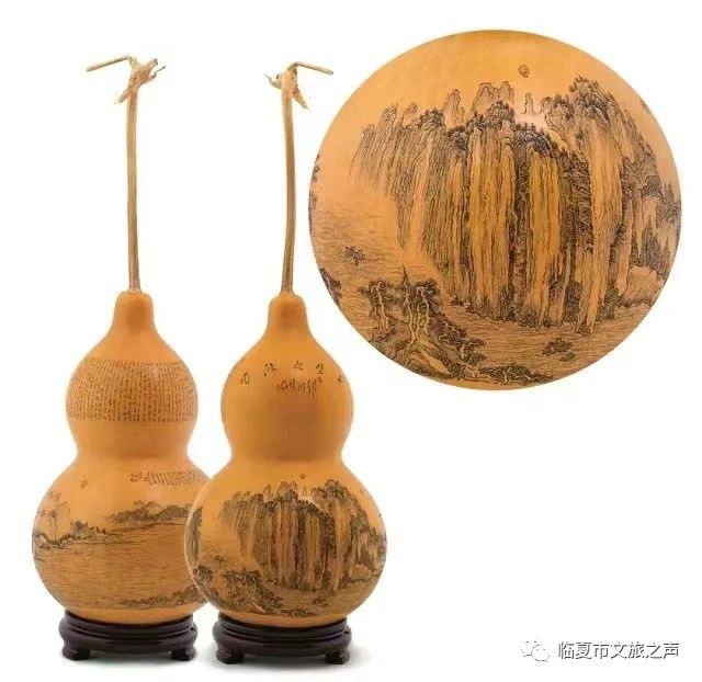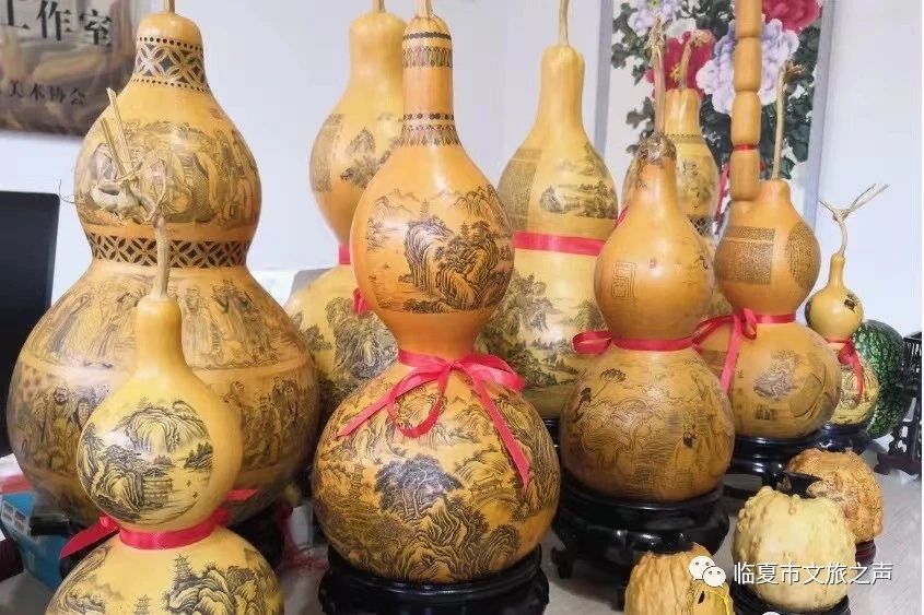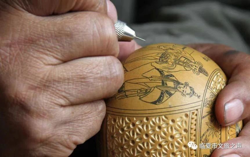 临夏的雕刻葫芦是省级非物质文化遗产之一,同时也是中国乃至世界上享誉盛名的民间技艺,主要是用针在葫芦表面进行线刻,来体现中国传统绘画山水、花鸟、人物和书法,然后涂上松墨,令其线条明晰。随着技艺高超的历代民间艺术家的不断发展创新,雕刻葫芦形成了自己独特的风格,成为欣赏收藏的艺术品。