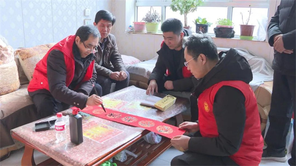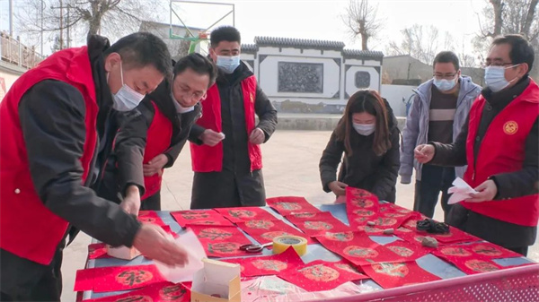 在南塬乡张河西村委会门前的小广场,一副副对联整齐摆放,场面十分壮观,洋溢着喜庆的氛围,为村民书写春联、送祝福,让中国优秀传统文化走进千家万户。活动现场被芳香的墨汁和喜庆的年味围绕,书法爱好者挥毫泼墨,隽秀的字体配上喜庆的祝福语,书写出对新年美好祝愿的春联,描绘着对美好生活的憧憬和期待。
