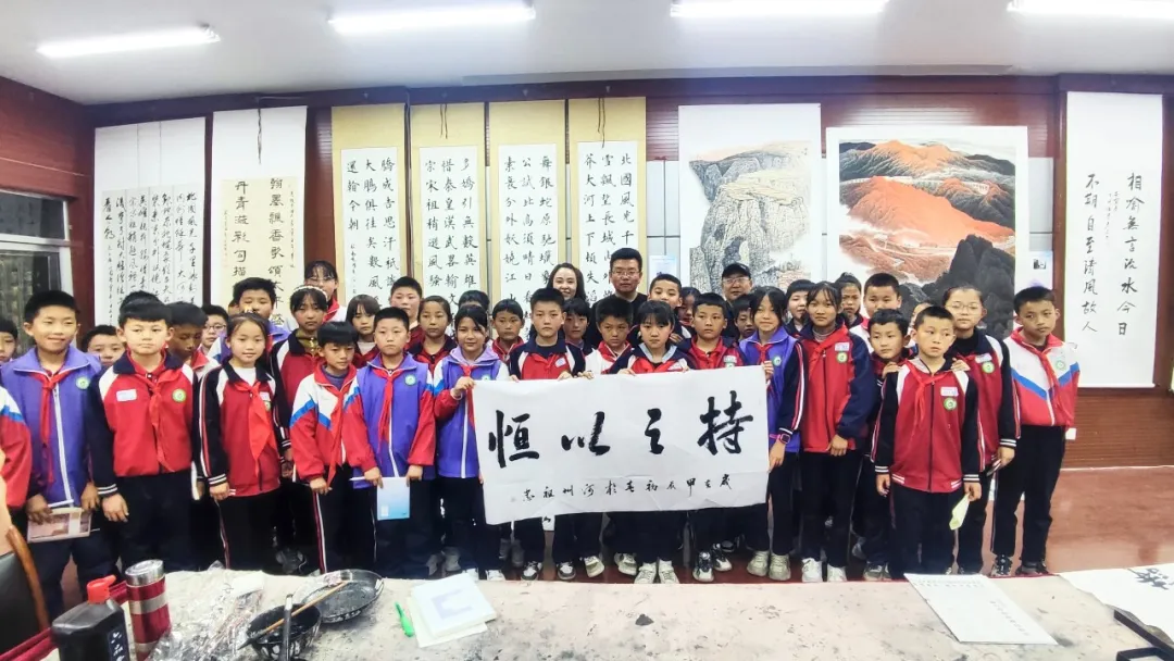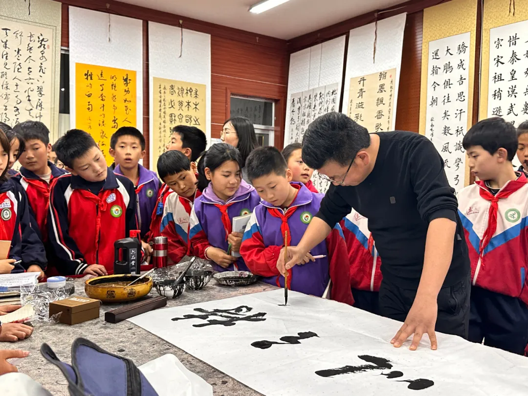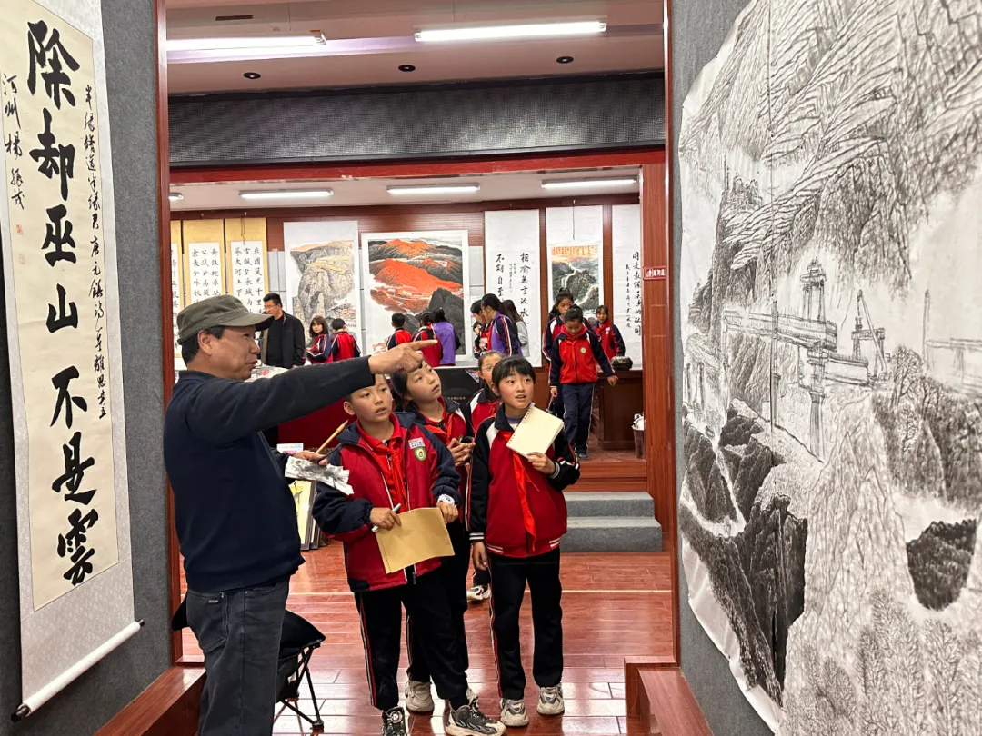 县文化馆陈学鸿老师向学生介绍了美术知识并鉴赏美术作品,县文化馆志愿者宋祖忠老师给学生讲解了书法知识,现场书写并赠送书法作品。