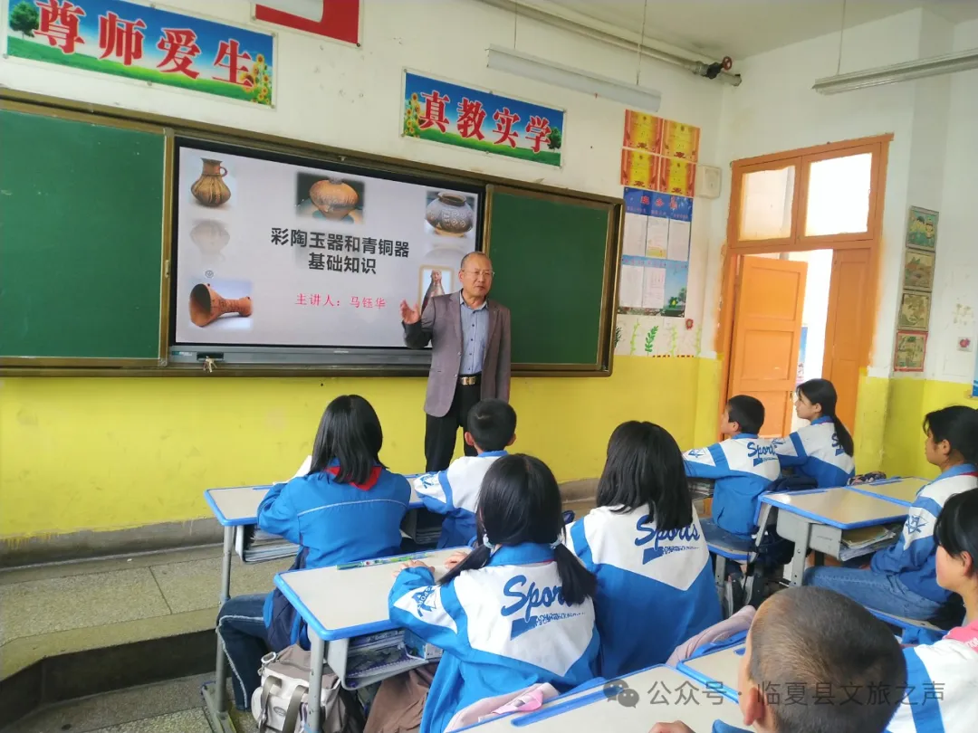 在创作书画的同时,来自临夏县博物馆的马钰华馆长,给学生们讲解了彩陶玉器和青铜器的基础知识。他结合PPT课件,以图文并茂的形式主要介绍彩陶的产生、断代,纹饰、文化内涵及制作技艺,内容从旧石器时代到大地湾文化、仰韶文化、马家窑文化、齐家文化、辛店文化、寺洼文化等彩陶、玉器、青铜器的基础知识。学生们被精美的彩陶、玉器、青铜器图片吸引住了,津津有味地听着讲解,不时举手提问,课堂气氛相当活跃。