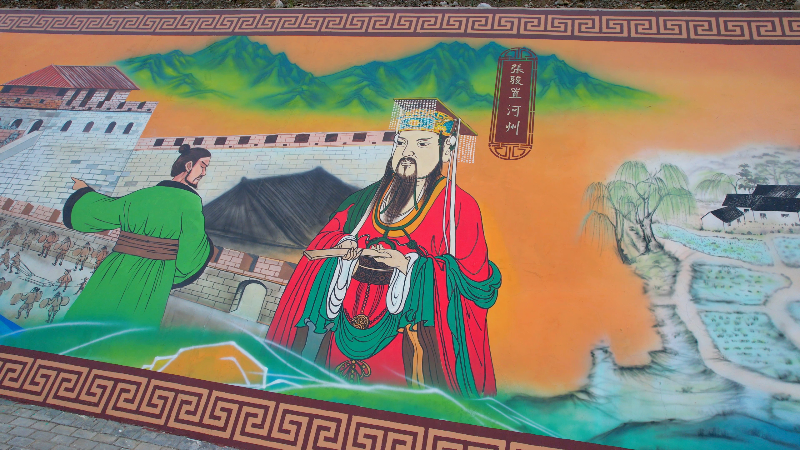 盘古开天辟地、愚公移山、大禹治水、孔子杏坛讲学、李白斗酒诗百篇、布楞沟的春天、太子山秋韵……在太子山旅游风情大通道临夏县段,一幅幅栩栩如生的彩色绘画跃然墙上,使昔日单调的墙面穿上了崭新的“外衣”。